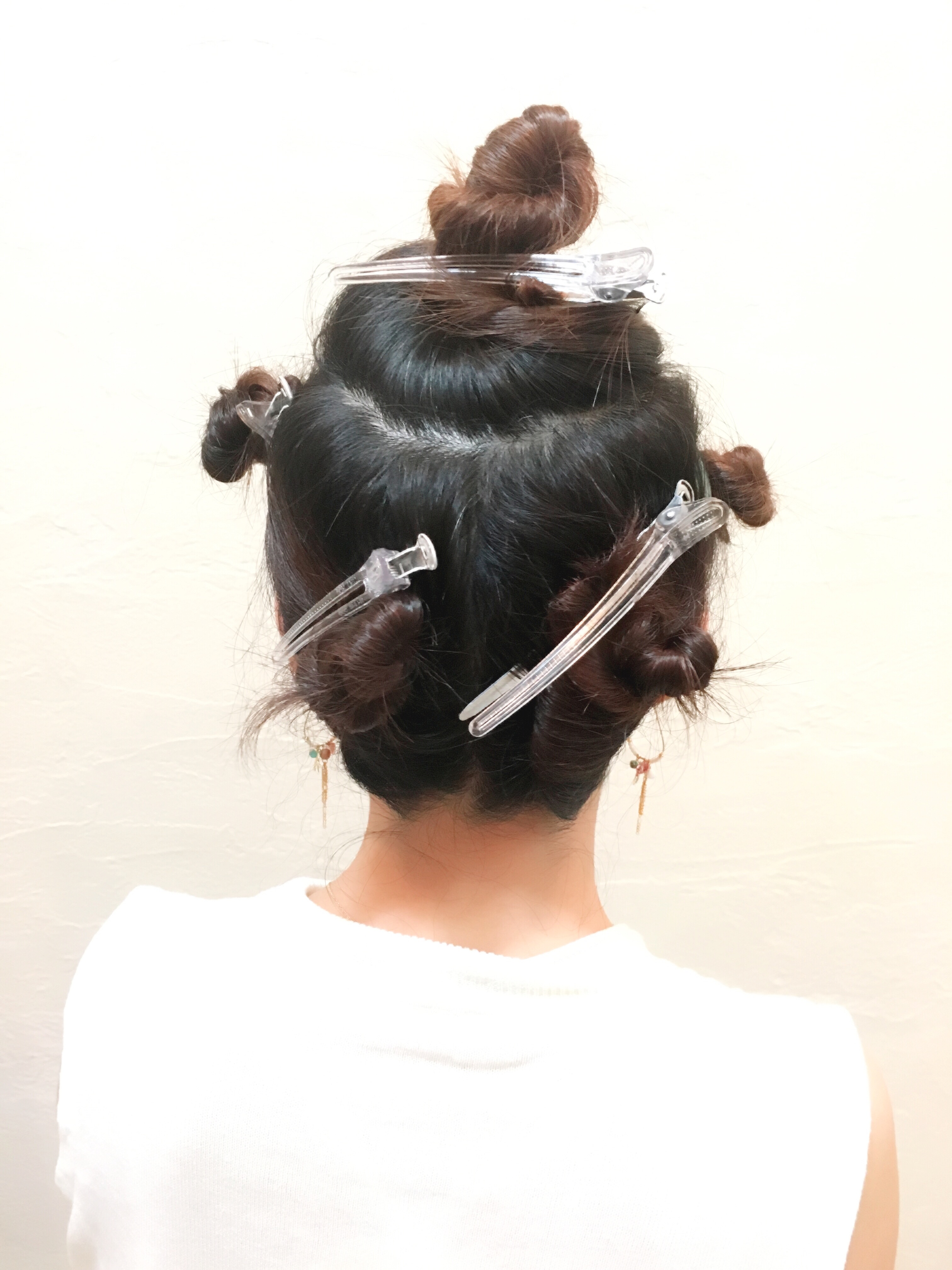 そして、ブロッキングした場所を、写真のように毛先まで強くネジってピンで留めておきます。(ネジった毛束を頭に近づけると自然とクルンと丸まって留めやすいです。)